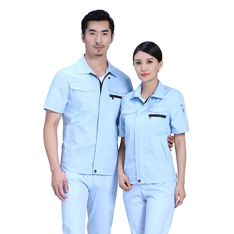 相关内拉链门襟宝蓝色夏季涤棉细斜短袖工作服FY62推荐